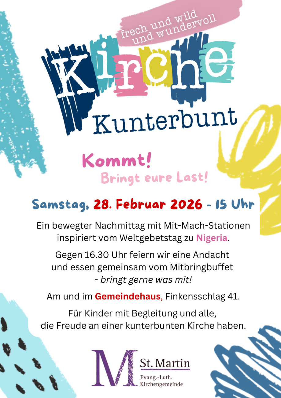 Herzliche Einladung zur Kirche Kunterbunt am 28.2.225 um 15 Uhr im Gemeindehaus.