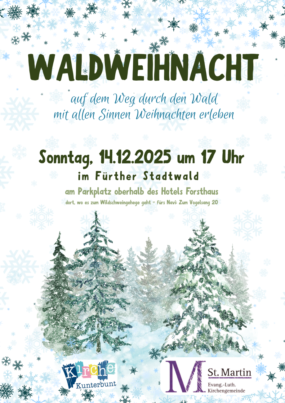 Am 14. Dezember um 17 Uhr ist Waldweihnacht im Waldweihnacht. Treffpunkt ist das Forsthaus. Freuen Sie sich auf ein besonderes Erlebnis im Wald. Erleben Sie einen besonderen Moment für Sie und ihr Kind.